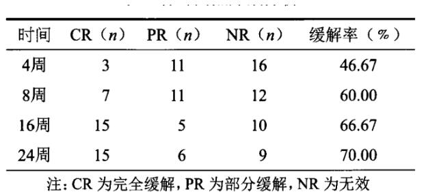 ②效价分析:4周缓解率为46.67%,缓解患者共14例;8周缓解率为60%,缓解患者增至18例;16周为66.67%,缓解患者增至20例;24周上升为70%,缓解患者增至21例。(注:缓解率为完全缓解和部分缓解之和)